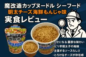 | 容疑者C:シーフード(明太チーズ海鮮もんじゃ味) | 約374kcal | 明太子のピリ辛+チーズの濃厚さで“もんじゃ化” | イカ、カニ風かまぼこ、チーズ加工品 | 「もんじゃ気分で濃厚シーフード」 |