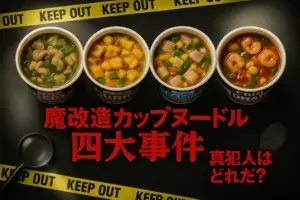 本事件を捜査した結果、浮かび上がった犯人像は「カップヌードルの常識を覆す濃厚もつ鍋風スープ」だった。にんにくとニラが共犯者、背脂が黒幕、そして“魔改造”という名のトリックがすべてを仕組んでいたのだ。証拠(口コミ・成分・実食レビュー)を突き合わせた結果、判決は次の通り——本件は**「背徳的なウマさ」**が真犯人であると断定する!